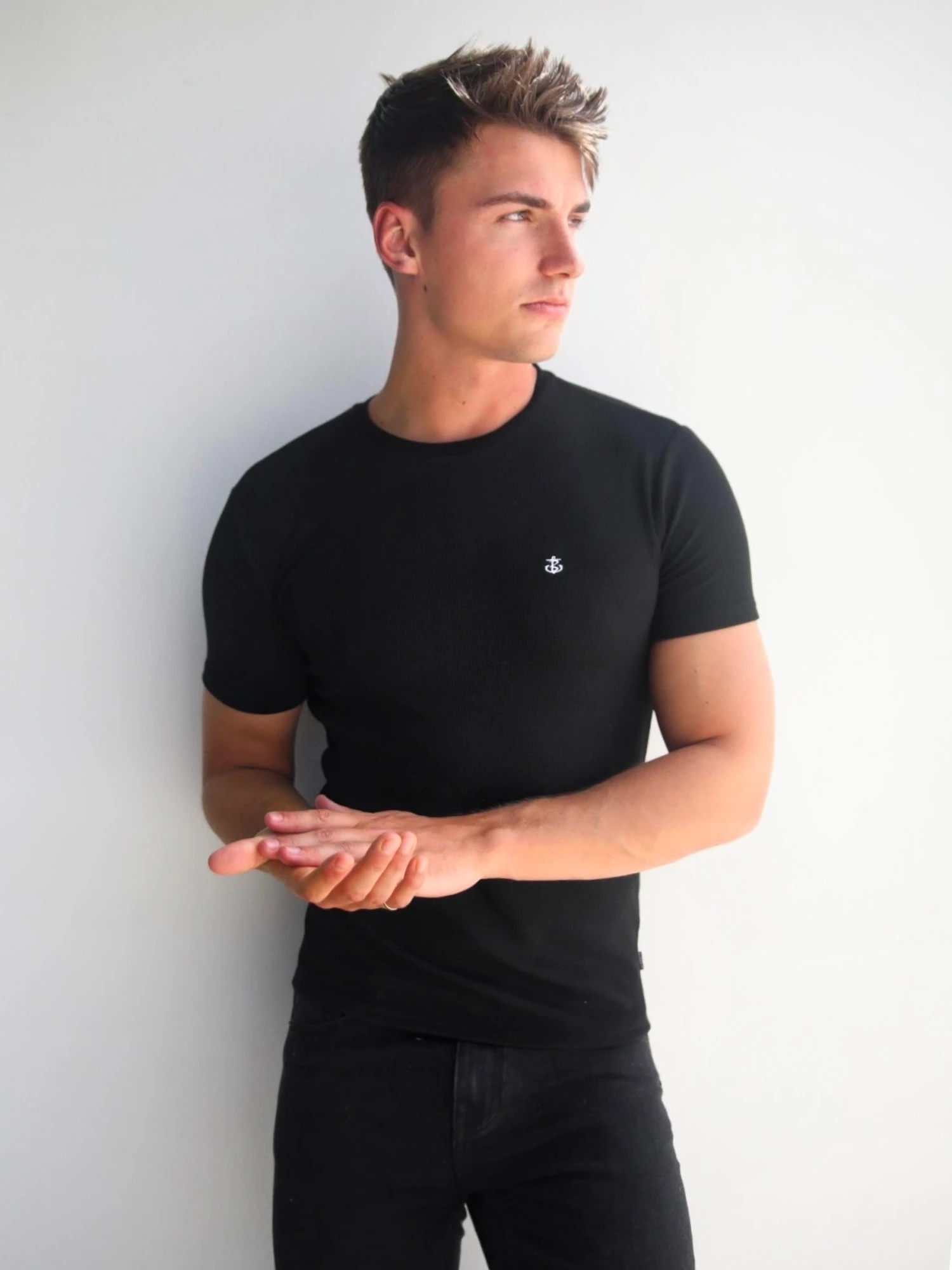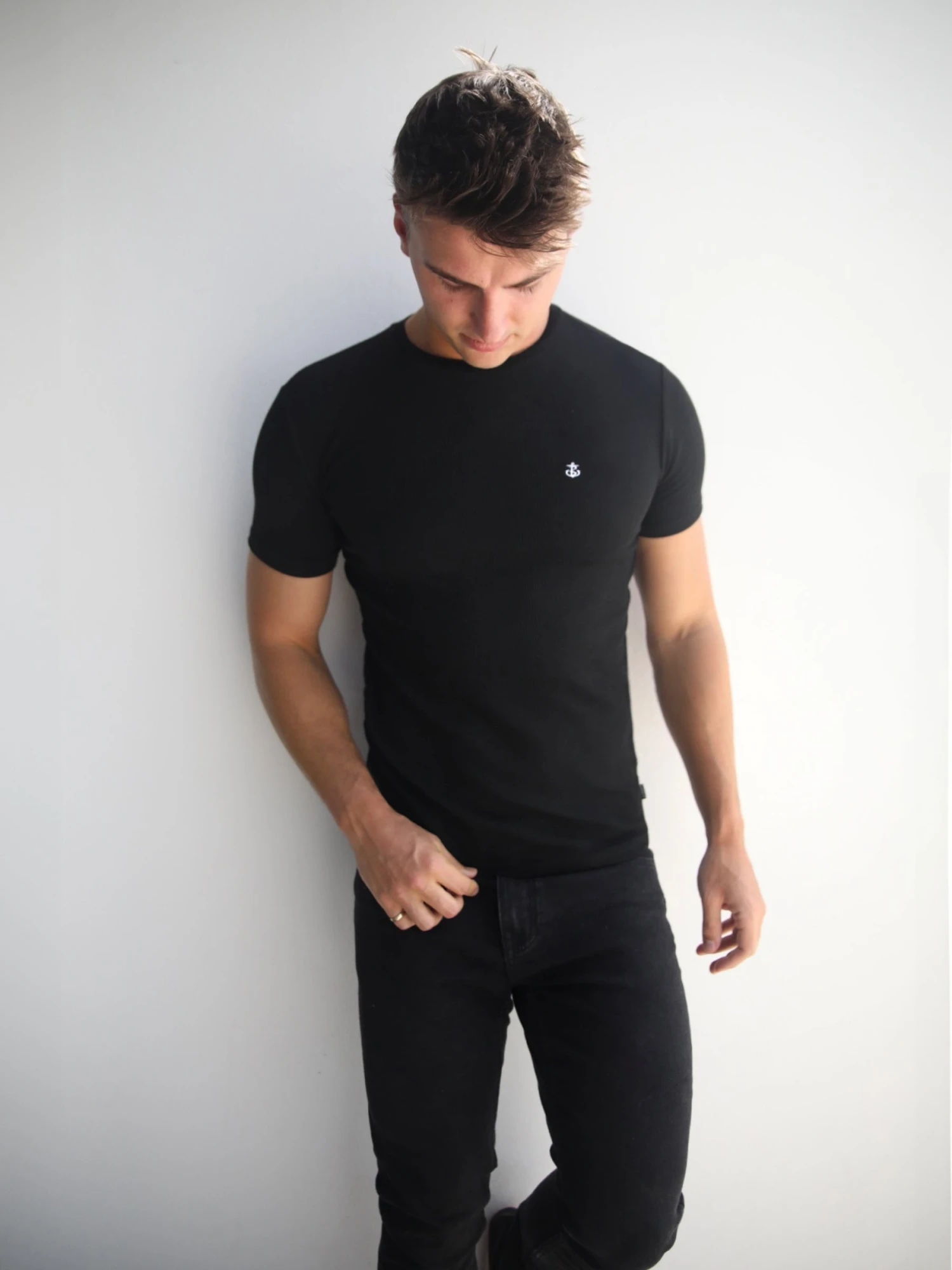 The Pirlo T-Shirt in black has a slim fit with a subtle ribbed texture and short sleeves. It features a crew neck collar and is finished with a white embroidered Anchor logo on the chest and a branded tab on the side seam.