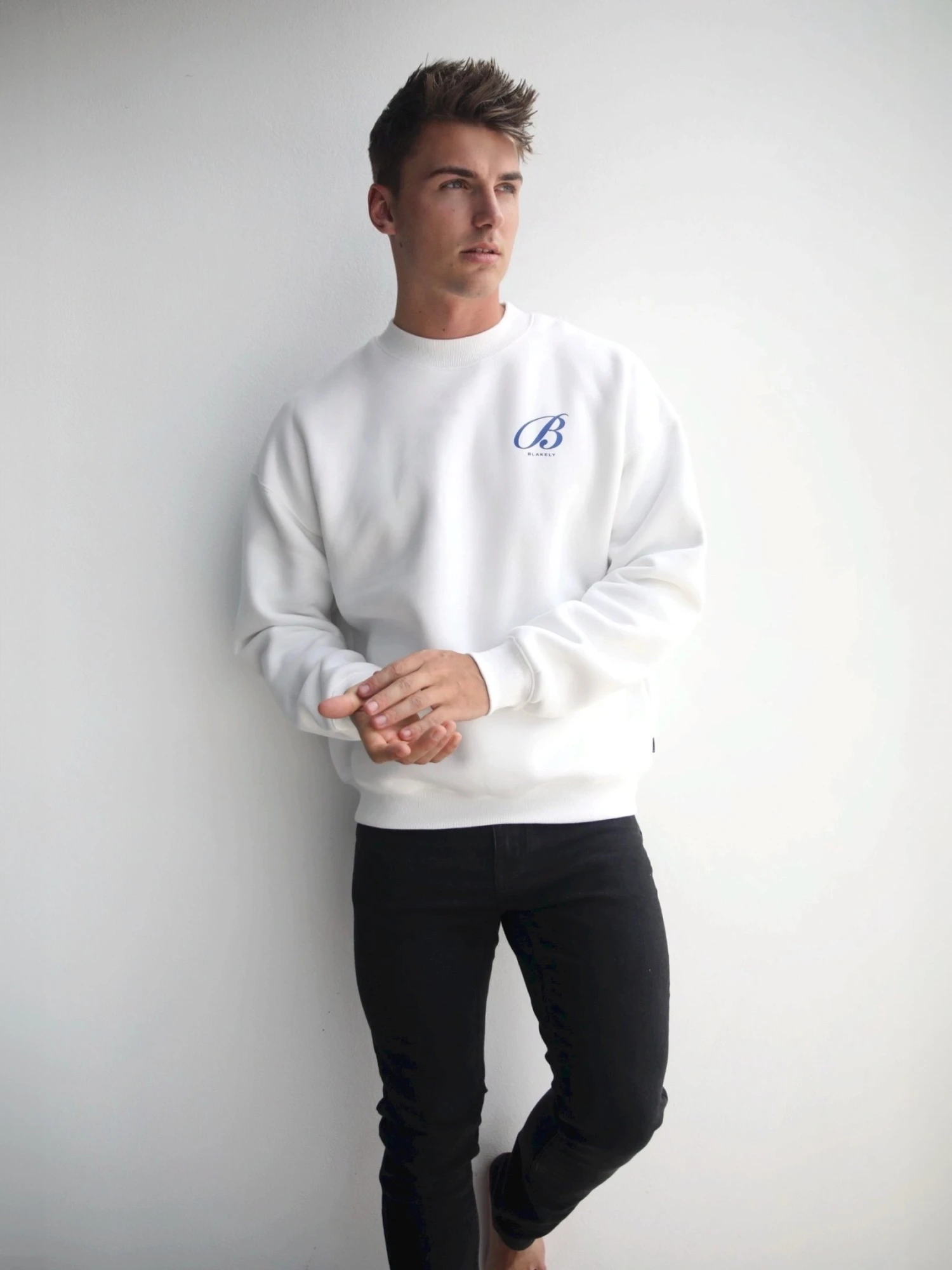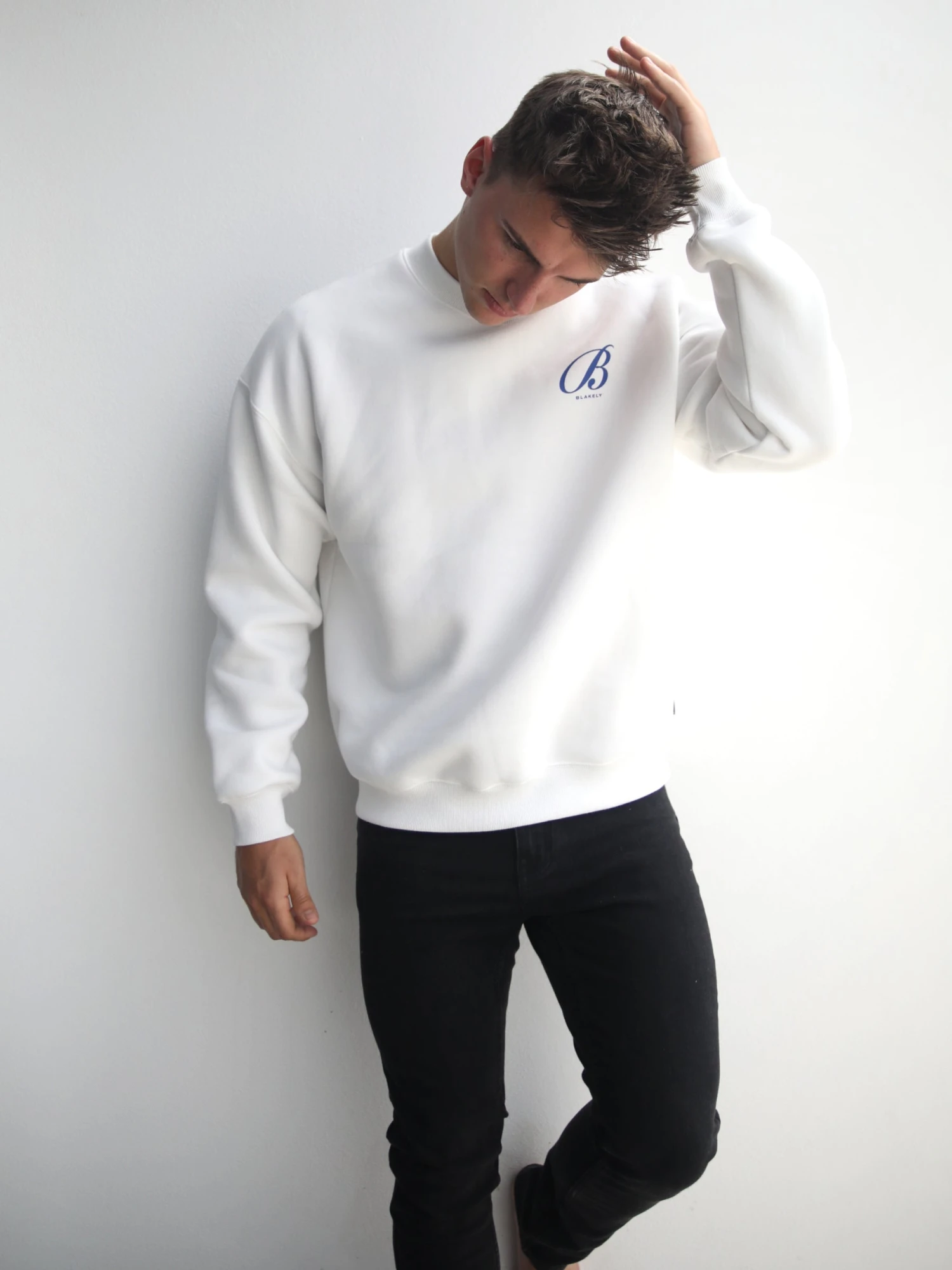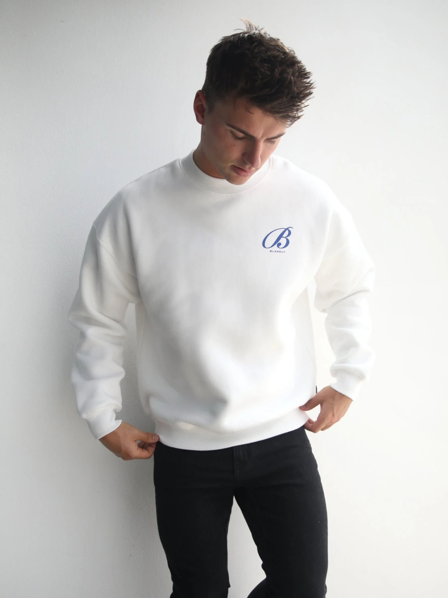 The Vita Jumper in flat white is crafted from a cotton blend with a relaxed fit. It has a ribbed hem and cuffs and is finished with a large graphic print in cobalt on the back & front.